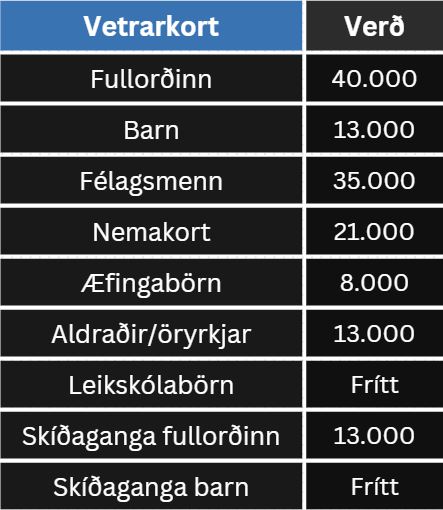 Lykilkort kostar 1500 krónur.  Kortin nýtast bæði sem dagskort og vetrarkort. Þegar keypt eru dagskort er fyllt á lykilkortið fyrir hvern keyptan dag.